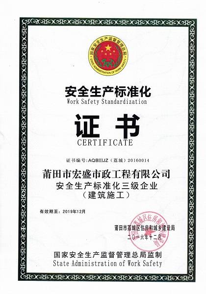宏盛市政荣获国家安全生产标准化三级证书