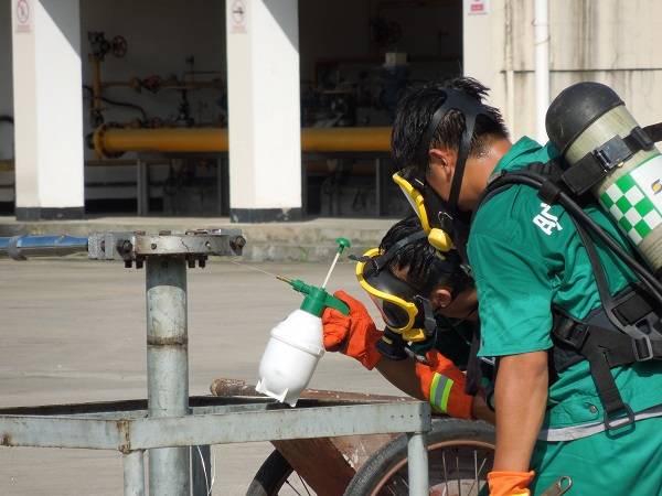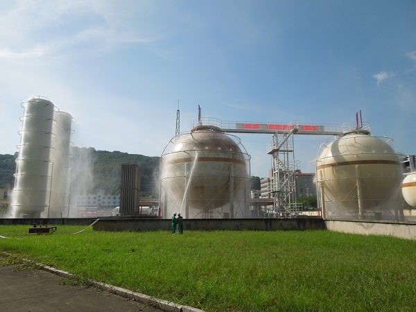 本次演练项目为:LPG1#储罐底部出口阀被恐怖分子破坏造成液化石油气泄漏事故的应急处置。主要流程为:模拟事故发生、制服歹徒、报警、应急启动、人员疏散、安全警戒、消防喷淋驱散稀释燃气浓度、抢险堵漏及最终解除警戒等。在总指挥的领导下,所有参演人员严肃认真、有条不紊地进行各个演练步骤,历时一个小时后,演练圆满结束。