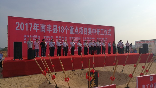 为进一步营造浓厚的项目建设氛围,推动县域经济赶超发展,2017年8月20日上午8:28,南丰县18个重点项目集中开工仪式在黄金工业园区举行。抚州市副市长徐国义出席仪式并讲话;县委书记吴自胜宣布开工并讲话;县委副书记、县长乐启文致辞。随后,南丰欧博最新能源有限公司、城区饮水工程和园区众创基地的代表分别代表企业发言。