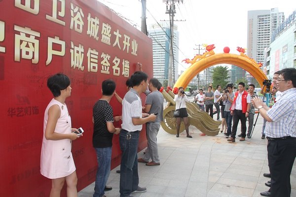 图为领导、嘉宾及卫浴城商户诚信签名墙合影