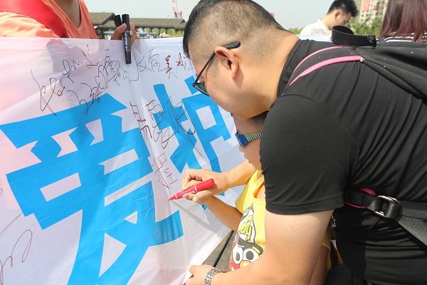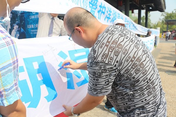 图为市民在”爱护洋湖湿地,保护湘江母亲河”横幅上签名