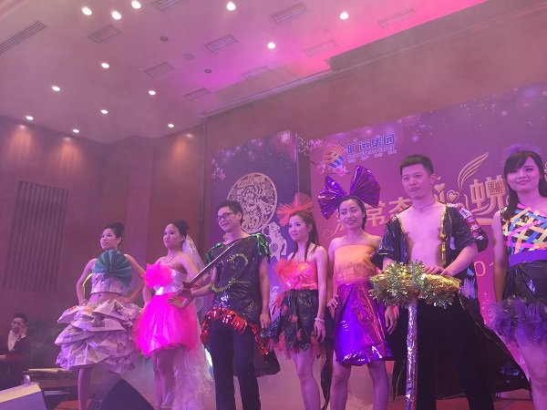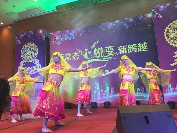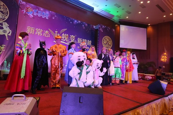 图为欧博最新欧博(中国)2015年迎春晚会现场高管变装登台拜年