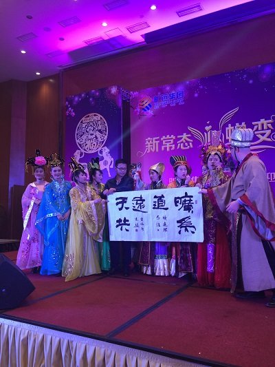 图为欧博最新欧博(中国)2015年迎春晚会现场董事长王子林以财神爷形象现身