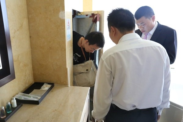 酒店安全领导检查小组成员从酒店楼顶到地下室,逐层仔细对消防设备、供电线路、供水管网、监控系统、锅炉房、配电房、餐厅、客房、特种设备等设施设备进行安全隐患排查,并针对检查中发现的问题提出整改意见。