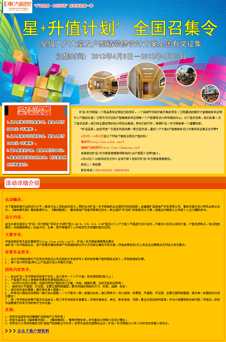 首届“欧博最新杯”家装设计大赛由福建欧博最新房地产开发有限公司、莆田市室内设计师协会联合主办,《海峡都市报》新闻中心、《莆田晚报》、莆田房地产信息网等单位协办。此次大赛旨在提高家装行业设计水平,激发行业人员的创作活力,同时也为欧博最新•东方银座的业主提供切实的回报。本次大赛诚邀业内精英以单位或个人名义踊跃参与。本届家装设计方案征集日期为2012年4月5日至2012年4月20日。