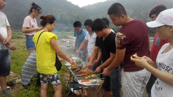 经过一番体能训练后,烧烤作为本次拓展训练的最后一个环节隆重登场。所有人员分工有序:女生洗菜、备料;男生积极主动地架起炉具,升炭火,所谓好事多磨,大家又是煽,又是吹,在烟雾缭绕中,炭火终于燃烧起来。几个有经验的烧烤高手,更是不辞辛劳地为大家服务,程总与郭总也一起加入到服务队伍中。不到三小时,大伙儿便陆陆续续把一堆烤肉、蔬菜“消灭”了。